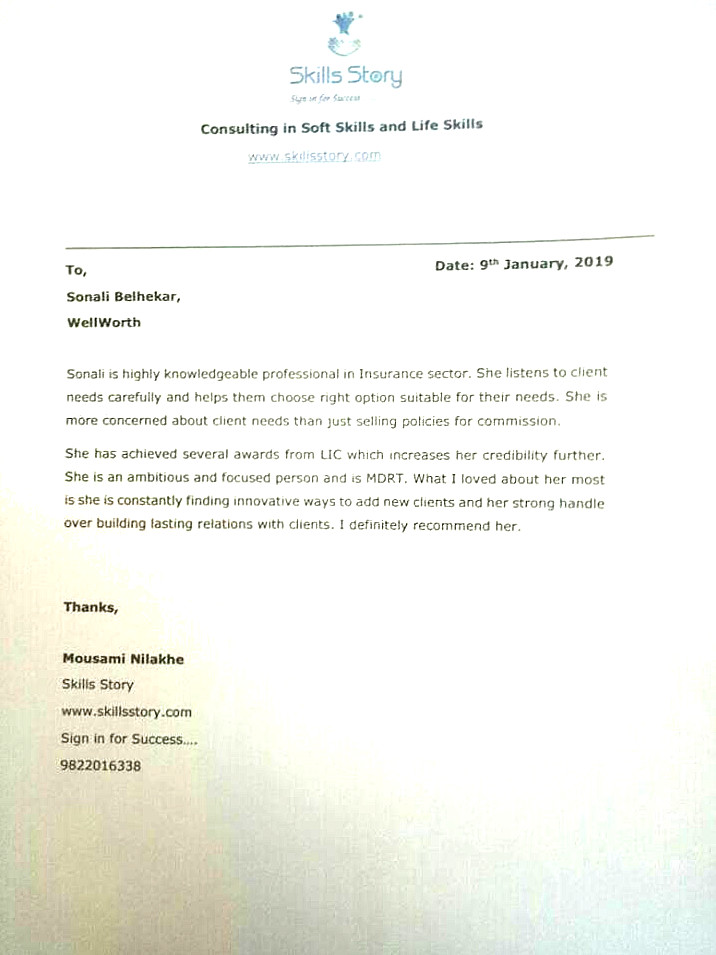 Sonali is not just highly experienced in her profession but very nice human being too. A very thorough financial expert who is always eager to help and resolve customer queries. For me and my family, she is not just an insurance agent but a family member. Just want to say that my Life is insured not be cause of LIC but because of her. I wish her good luck and am sure she will scale new heights as time passes by