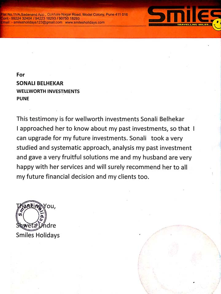 Sonali Belhekar is a MDRT Financial Advisor for Insurance and Investments. Specialize in NRIs and HNIs investments and Claim Settlements. Her expertise help her clients take financial decisions at right time, in right product and in right manner.